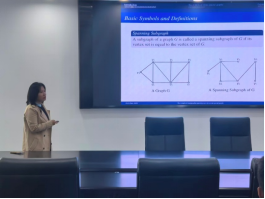 会议伊始,陈晓东老师以《一些特殊图的2-完全独立生成树存在性》为题,从完全独立生成树在网络传输中的应用价值引入,重点分享了2-完全独立生成树的相关研究与禁用子图中2-完全独立生成树的存在性结论,并与大家深入交流,加深了学生对图论中生成树的理解。